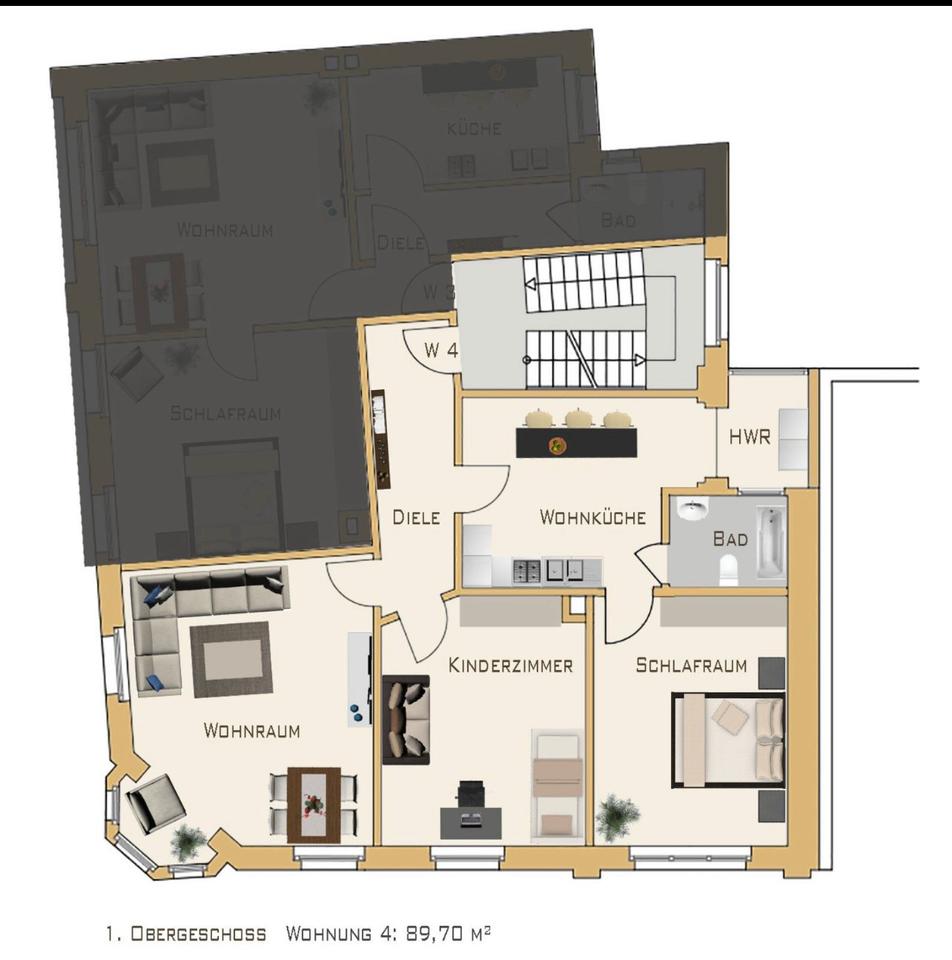 Diese Wohnung im 1. Obergeschoss verfügt über 3 große, klar geschnittene Räume, hohen Decken mit einer Gesamtfläche von 90 qm.